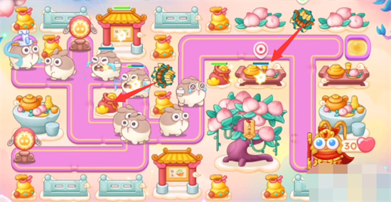 4、在后方放置雷达把后方的道具全清放置多重箭之后就锁定桃树即可。