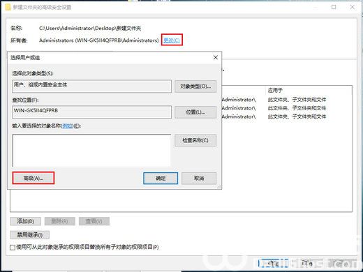 步骤2:接下来,点击“所有者”后面的【更改】按钮。在“选择用户或组”的窗口中点击【高级】按钮。