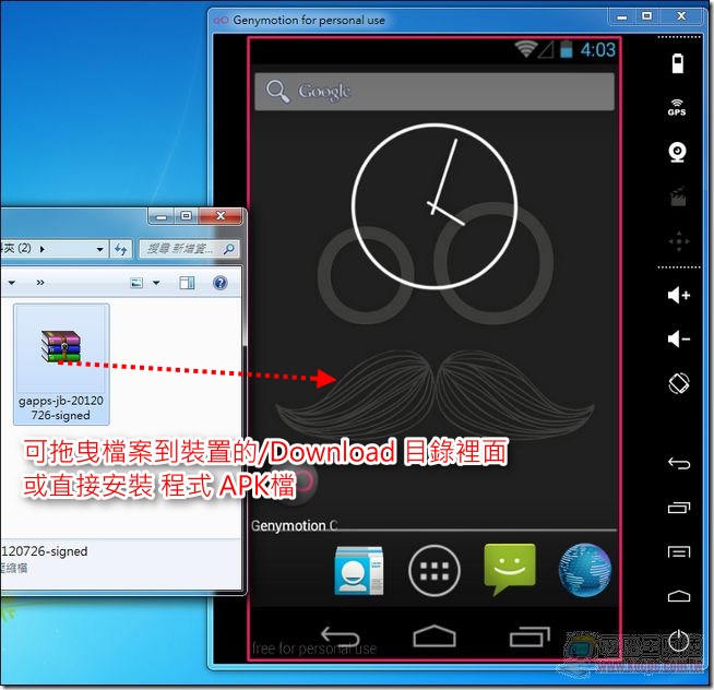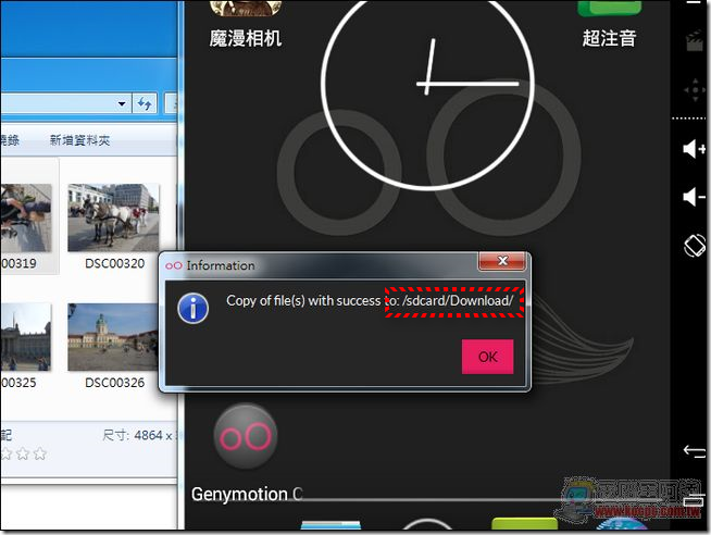 或者直接拖曳照片到Genymotion模拟器视窗中,档案会存放到「/Download/」目录中: