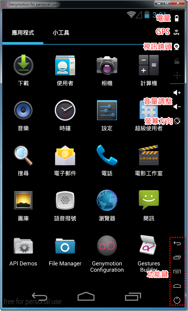 稍等一下(约30秒~两分钟,如果一直黑屏请关掉重新执行)在新视窗中就会出现一个功能完整的Android装置,不过里面不会有任何的Google服务。在视窗右侧会有可设定模拟的项目,部分功能(操作录像)是付费功能,有兴趣的朋友可以看看原厂报价: