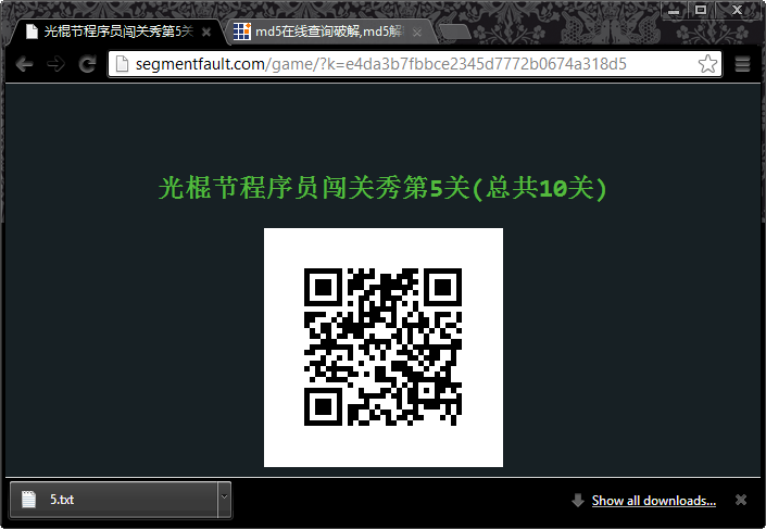 MD5加密的一个Key, 去MD5解密的网站一查是4。用5的MD5码作为Key,就可以过关了。