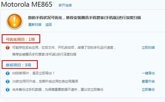 体检报告中的可优化项目、推荐项目和已完成项目列得清清楚楚(图3),让您对您的手机的健康状况有个最基本了解。如果您的Android手机安装了腾讯手机管家(手机版),还能对手机进行深度扫描安全体检。