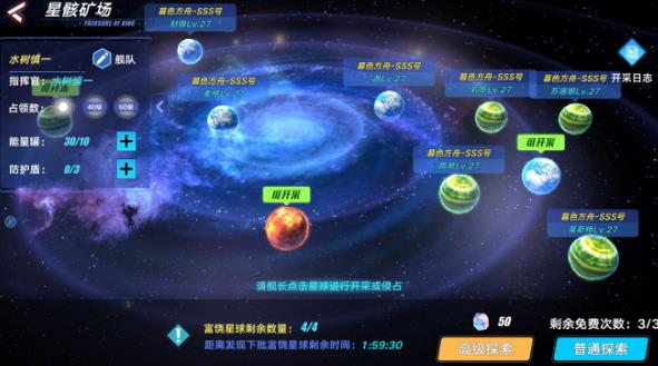 ① 资源评级:按照收益的从少到多,分为普通、良好、富饶。由于每次开采耗费较长时间,每日可开采的机会有限,尽量选择收益高的星球进行开采。 如果界面中的三个可开采星球中,都没有富饶的星球也没有关系,我们可以点击“普通探索”刷新一下星球,每天有3次免费的次数,超过后会消耗金币进行刷新。还可以直接花费氪晶,进行高级探索,高级探索可以大幅增加刷出高品质星球的几率。