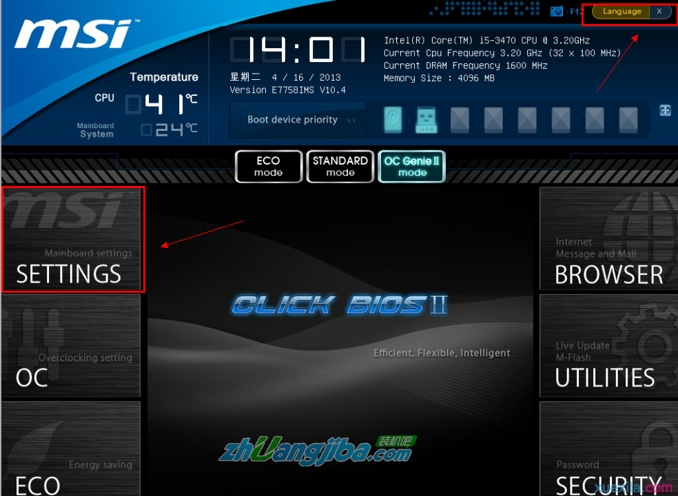 3、我们也可以进入菜单进入设置第一启动项,在右上角“language”处切换成中文,然后用“TAB”键或鼠标将光标移动到“SETTINGS”处,点击回车。(光标移到“SETTINGS”项时会亮起)。