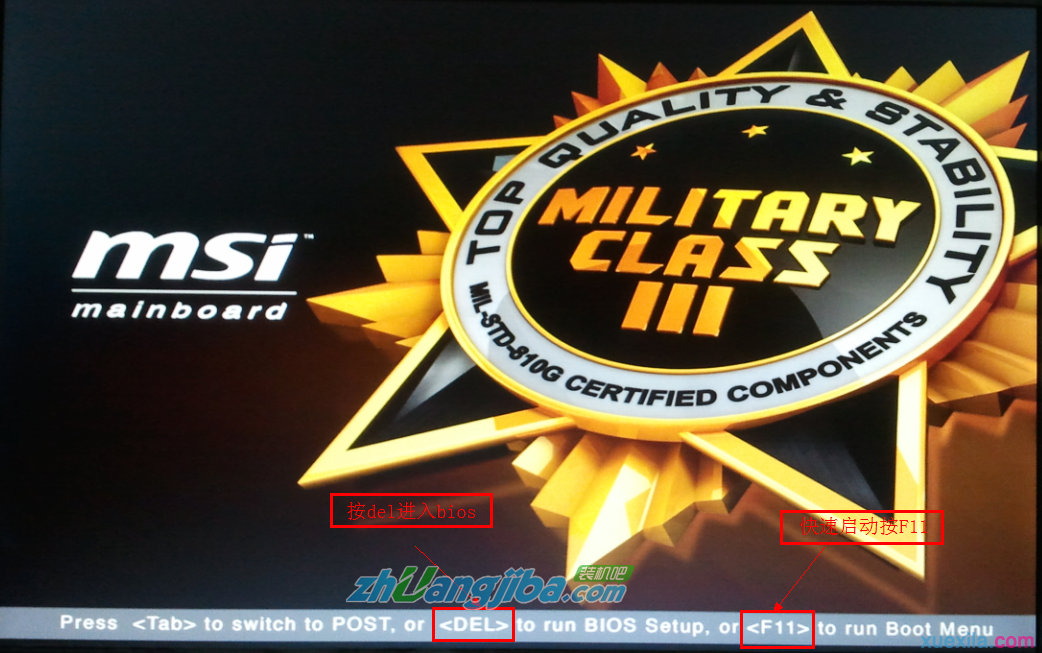 1、首先我们要进入微星主板的BIOS系统,按下开机键,出现微星logo界面时立即不停的按“DEL”键(如果想要设置U盘启动,直接按F11选择U盘启动即可)