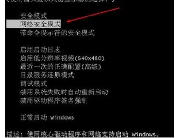 2.然后再开机按F8键(这时键盘肯定能用),然后到高级启动选项下选择”带网络的安全模式“。