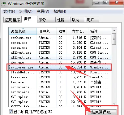 1、打开任务管理器,在进程下结束explorer.exe进程;
