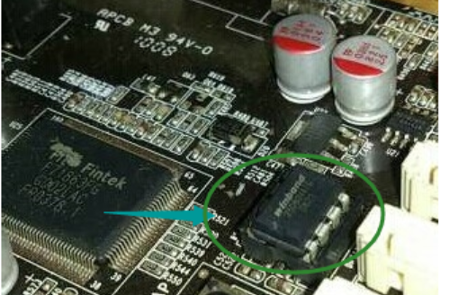 2、等BIOS对应文件下载完毕之后,接着使用小镊子将电脑主板上需要刷新的BIOS取下来。注意拿BIOS时必须是断电状态,如图所示,将这个很小的BIOS取下来,操作利索些。