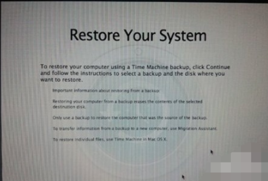 六. 选择“Restore From Time Machine Backup”会出现如下界面,选择 你以前备份过的Time Machine 备份。选择“continue”。