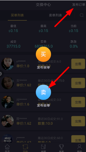 2、只要点击“交换中心”右上角的“发布订单”按钮,选择“发布卖单”功能就可以创建订单卖出自己的糖果。