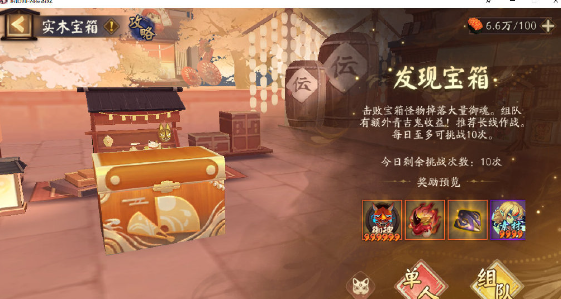 宝箱挑战一次消耗100体力,每天可以挑战10次。我们可以选择单人挑战也可以选择组队挑战,最多5人组队。这里推荐大家优先选择组队挑战,比单人挑战能多1-2个青吉鬼。