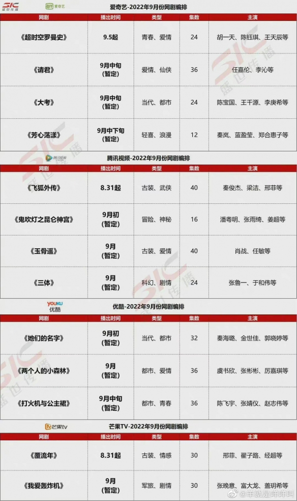 爱奇艺腾讯优酷芒果9月排播表 爱奇艺腾讯优酷芒果9月网剧编排