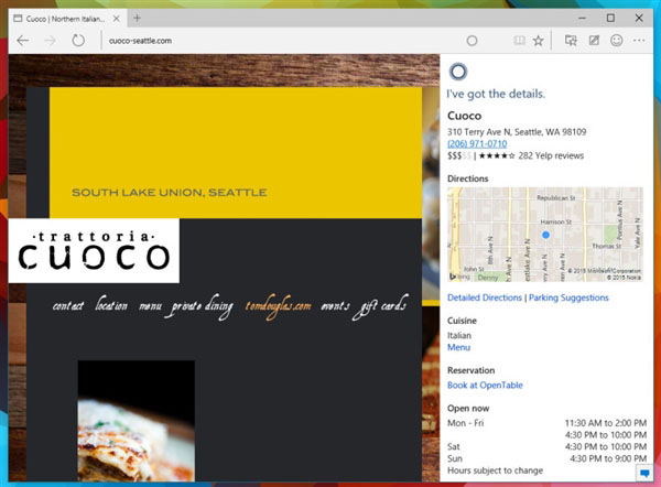 不过也有例外,名为Cuoco-Seattle的餐厅主页就提供了Cortana助手功能,当用户访问该页面,Cortana助手便会在屏幕右侧列出餐厅的位置、菜单、营业时间等实用信息。