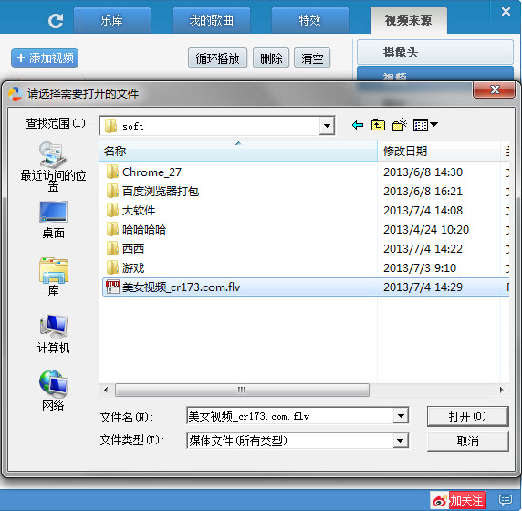 2.继续在乐库中点击按钮"视频来源",其实目的是插入本地准备好的美女视频