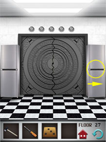第二十七关(第27层):首先将门右侧的冰箱向右移动,露出墙上的裂纹。