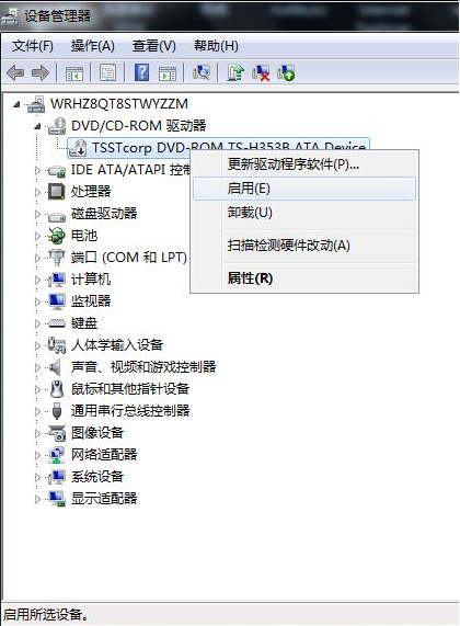 在设备管理器中展开DVD/CD-ROM 驱动器的选项,右键点击被禁用的光驱,选择启动,这样就可以解决不小心禁用光驱的问题了。