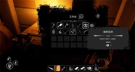 7.收集到足够的物资,我们就去工作台那里做武器,做一些捕熊陷阱。