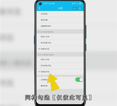 在设置页面中,我们可以看到谁可以访问我的情侣空间一栏,勾选【仅彼此可见】,在谁可以在恩爱榜上看到我一栏,同样勾选【仅彼此可见】,这样别人就无法再看到你的情侣空间;
