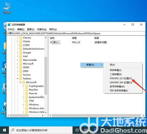 4、在右侧窗口新建“Dword(32位)值”,命名为“AllowWindowsInkWorkspace”;