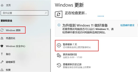 3.在【系统和更新/Windows更新】页面,点击【暂停更新7天】操作即可。