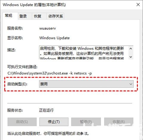 3、在弹出的“Windows Update的属性”对话框中,将“启动类型”设置为“禁用”。