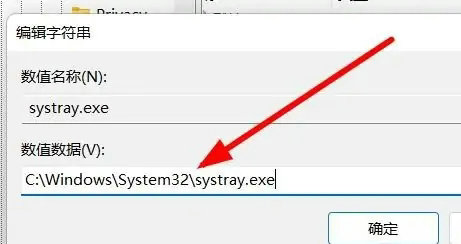 7、双击命令,在弹出的窗口中将数值更改为:C:WindowsSystem32systray.exe即可完成