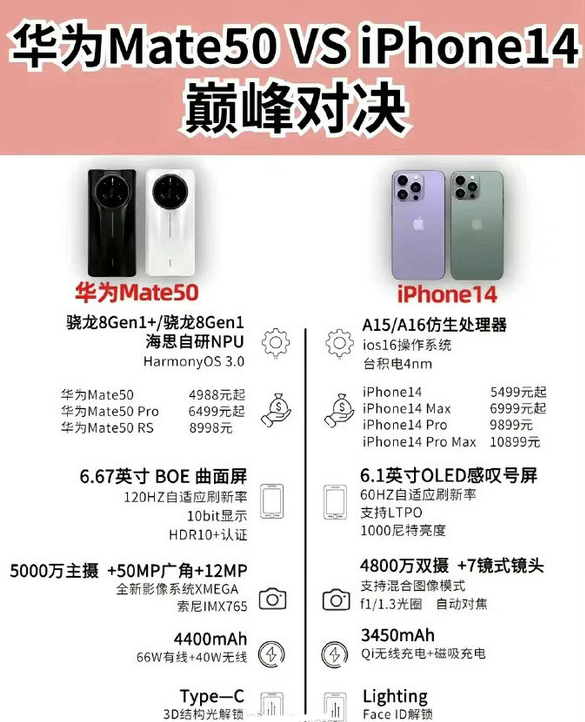价格方面,爆料称华为Mate50售价4988元起,Mate50 Pro售价6499元起,Mate50 RS售价8988元起;iPhone 14售价5499元起,14 Max售价6999元起,14 Pro售价9899元起,14 Pro Max售价10899元起。可以看到,除了标准版iPhone 14仅比Mate50贵了500元左右外,高配版iPhone 14系列比Mare50系列贵了不止一点半点。