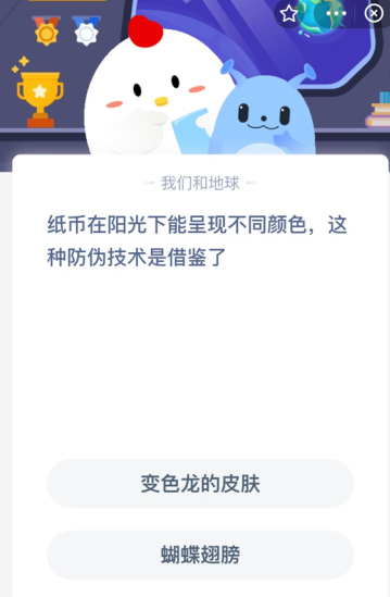 今天的问题是:纸币在阳光下能呈现不同颜色,这种防伪技术是借鉴了?