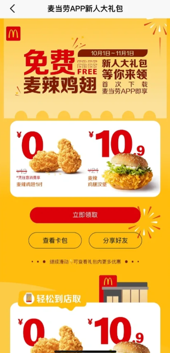 1,首次下载麦当劳app的,新人大礼包等你来领取!赶紧哦!