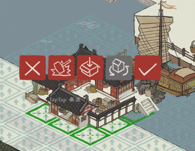 在【营造-居住】中找到商栈。商栈需要摆放于杭州北面的大运河旁,右上方三格必须造在运河上,方便船只装货卸货,摆放如下图所示。