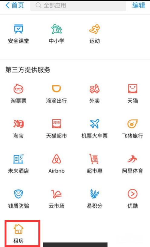 2.打开全部应用后,下拉至最底部,可以看到有租房入口