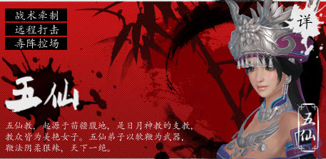 五仙教,起源于苗疆腹地,是日月神教的支教,教众皆为美艳女子。五仙弟子以软鞭为武器,鞭法阴柔狠辣,天下一绝。她们奉蛇、蜈蚣、蝎子、蜘蛛和蟾 蜍为尊,又爱与毒虫为伍,擅长蛊毒之术,因此外人称之为“五毒教”,江湖中人因此避而远之。