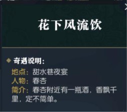 甜水巷门口阿刚(491,649)对话进入剧本甜水巷,于春杏身旁桌上(496,696)右键千日醉,饮十次有几率触发,触发后没有任务,跟随红枫叶NPC听他说完即可。