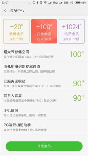 除此之外,小米云服务还为用户提供了白金会员和钻石会员两种服务。两种会员都具备手机每天备份和PC端云助手的功能,不同的是,白金会员可增加云存储空间100G,云服务回收站和联系人恢复可达90天;钻石会员可增加1024G云存储空间,云服务回收站和联系人恢复可达180天(半年)。资费方面,白金会员为12米币/月,钻石会员为60米币/月。