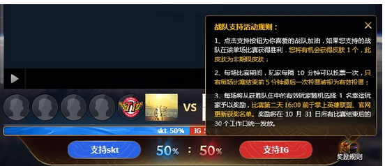 活动介绍:在观看比赛直播时,您可以每隔10分钟为自己支持的战队加油1次,每单场比赛结束后,我们会在比赛结束前5分钟最后一次投注获胜队伍的玩家中随机挑选1名幸运玩家奖励皮肤(非期限)1个。