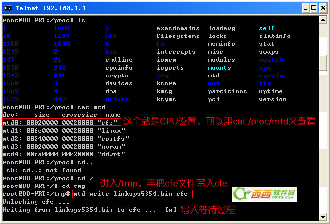 6、Telnet进入路由器,建议在刷前,用命令先备份一下cfe,再根据我下面的命令来刷CFE
