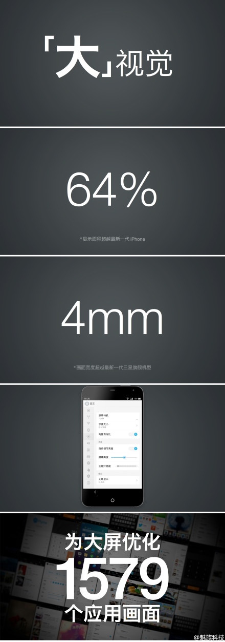 MX3比iPhone 5屏幕面积多了64%,MX3上的Flyme OS为大屏幕优化,一共调整了1579个应用画面,同时还加入了大量动画,接收邮件、删除便签、登陆错误……等等等等都有动画。