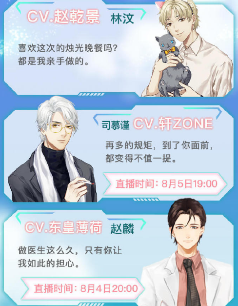 每天可以解锁一个男友和他对话,配音CV有杰大,逍遥散人,宝木中阳,轩ZONE,赵乾景,柒夜,糖醋排骨,东皇薄荷,好多好多,各种类型男神应有尽有,等你来解锁哟。
