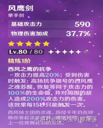 80级风鹰剑590基础攻击,37.7%物理伤害加成,特效为20%攻击力,以及15秒一次的挨打回血和反伤。