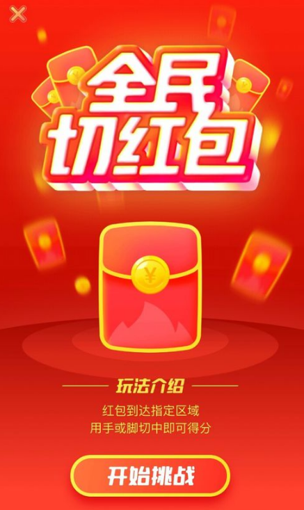 2、点击进入到活动页面以后,点击页面下方的“开始挑战”按钮即可参与切红包游戏。游戏开始以后,会有红包在页面中显示,当红包到达了指定区域的时候,大家可以用手或者脚来切红包,切中了就可以得分哦!