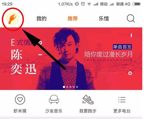 4.在“虾米音乐”的首页中点击左上方红色圈住的地方。