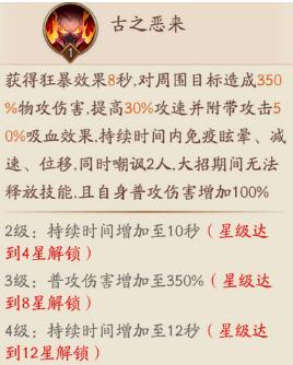 优势:怒气技会提供高额的输出能力与超强的免疫控制效果,技能:勇战的加攻速也可以在典韦释放完绝大多数技能后再开启怒气技时,与其的攻速相互叠加,使典韦能成为魏国主力输出的原因。