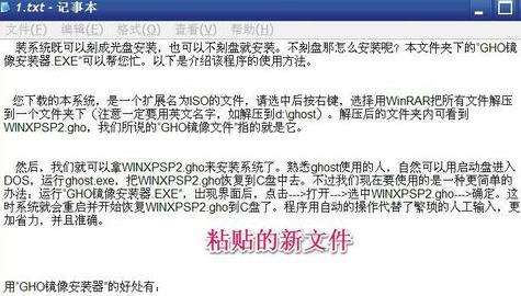 8,用键盘上的Ctrl + V 键,将源文件“镜像安装器使用方法.TXT”内容粘贴到这个“1.txt”文件中。