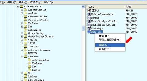 HKEY_CURRENT_USERSoftwareMicrosoftWindowsCurrentVersionPoliciesExplorer分支。查看右边的窗口是否有DWORD的键值NOdrives,如有将其删除重启电脑。