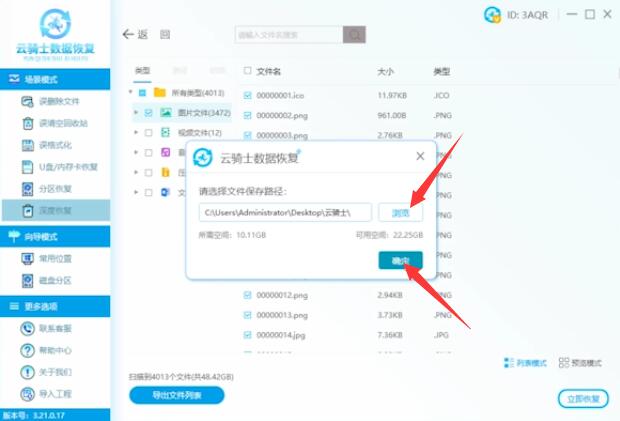 1、打开云骑士数据恢复软件,点击深度恢复,选择需要恢复的分区,点击开始扫描。