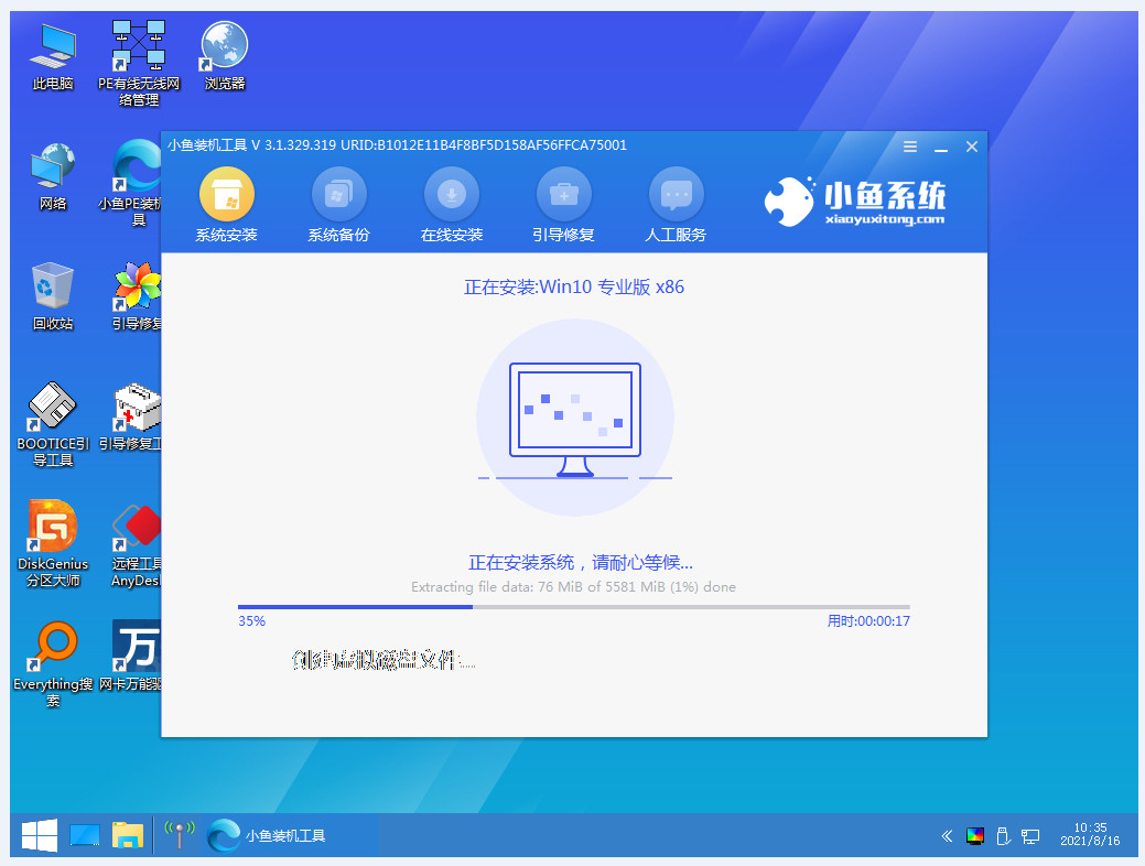 6、重启后进入pe系统中,软件会继续安装win10系统。