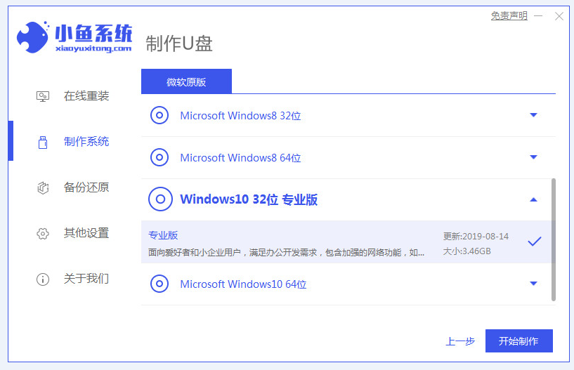 2、选择需要重装的系统,选定后点击开始制作。