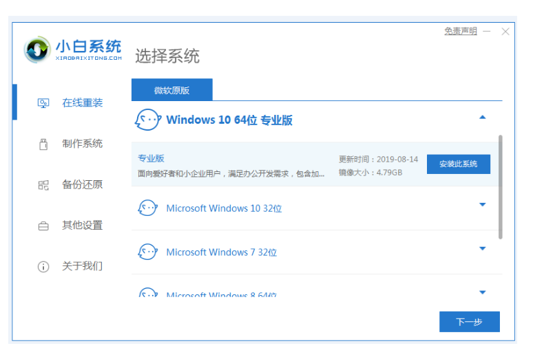 1、下载并运行小白一键重装系统软件,进入“在线重装”中,选择想重装的系统。