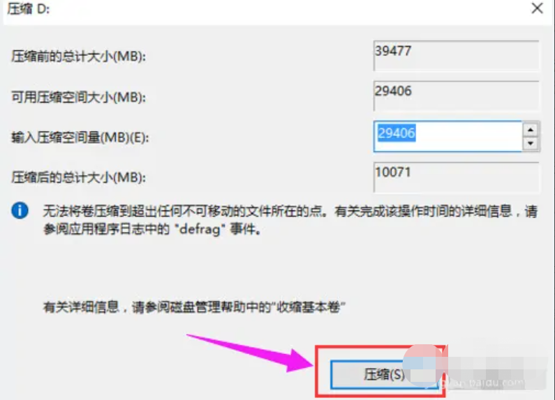 系统会计算出可以压缩空间,输入你需要压缩空间,然后点击:压缩。