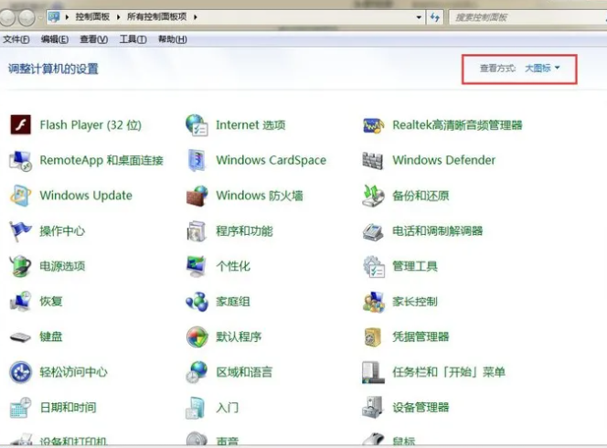 1、首先我们点击【开始】菜单,在菜单中找到【控制面板】,点击进入控制面板,点击右上角的【查看方式】选项,弹出选项中选择【大图标】;将【查看方式】更改为【大图标】。